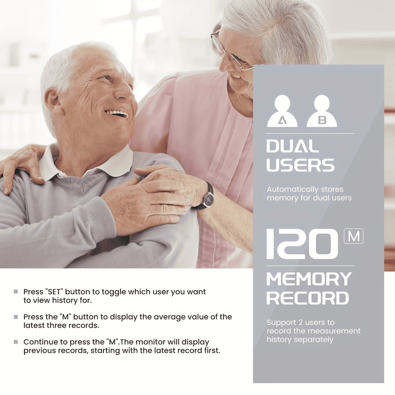 Jusqu’à 120 enregistrements par utilisateur, avec date et heure — pratique pour suivre l’évolution de votre tension dans le temps.